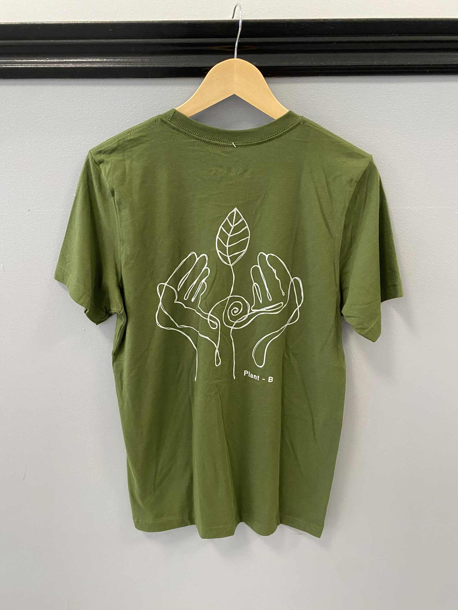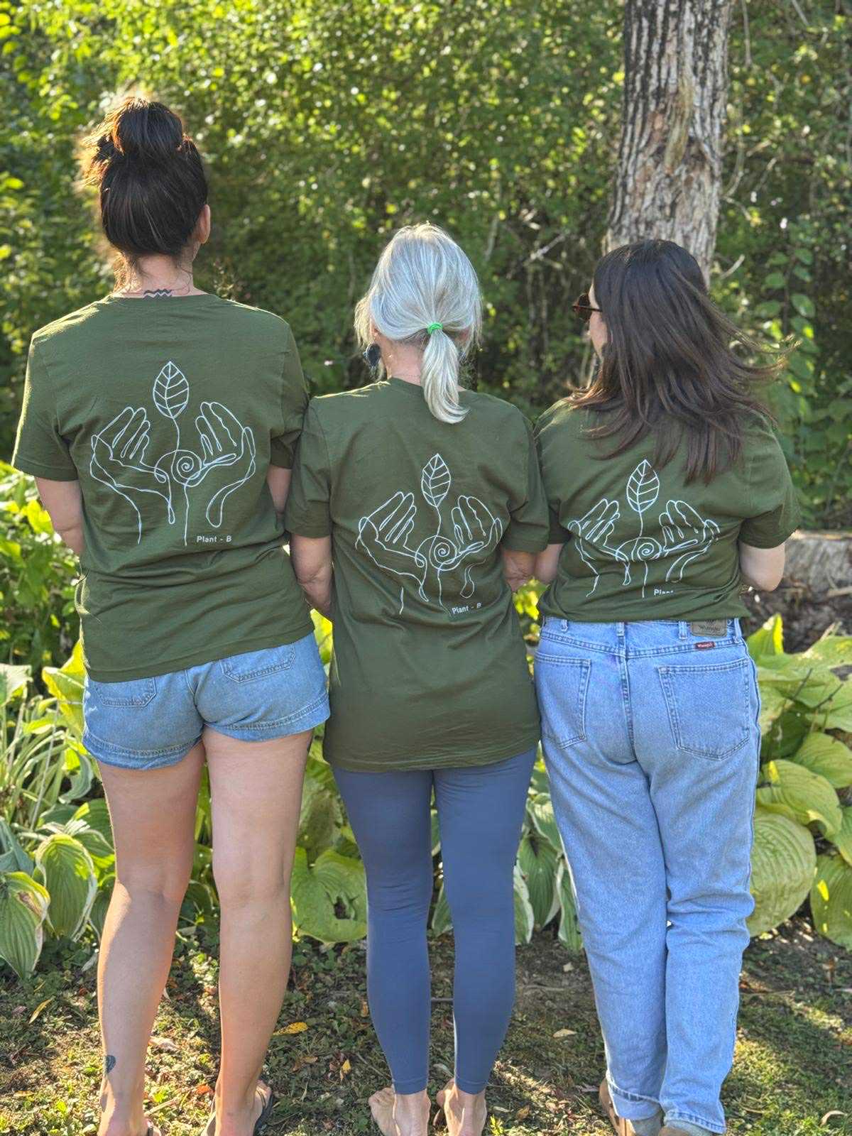 Our ultra comfy light weight tee in olive green. Ethically and sustainably manufactured using blue sign certified dyes. On this shirt we added our origins print on the back and a hand drawn leaf on front hip. Look great and feel ready for adventure with our Plant- B super soft tee.